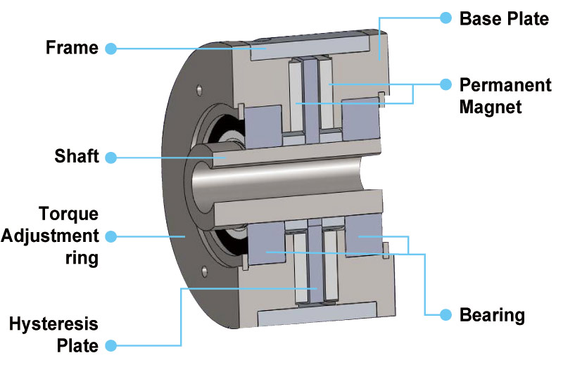 Torque is established by a relative resistance force generated by permanent magnets on two base plates and the hysteresis plate on the shaft. The output torque adjustment can be controlled with different variations in magnet angles.